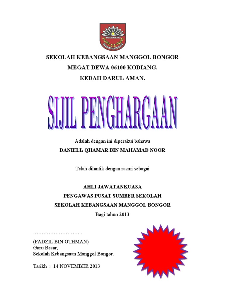 Contoh sijil penghargaan pengawas sekolah malayruda. Contoh sijil penghargaan dan boleh diedit. 7222019 sijil penghargaan pengawas pss 11sekolah kebangsaan manggol bongormegat dewa 06100.