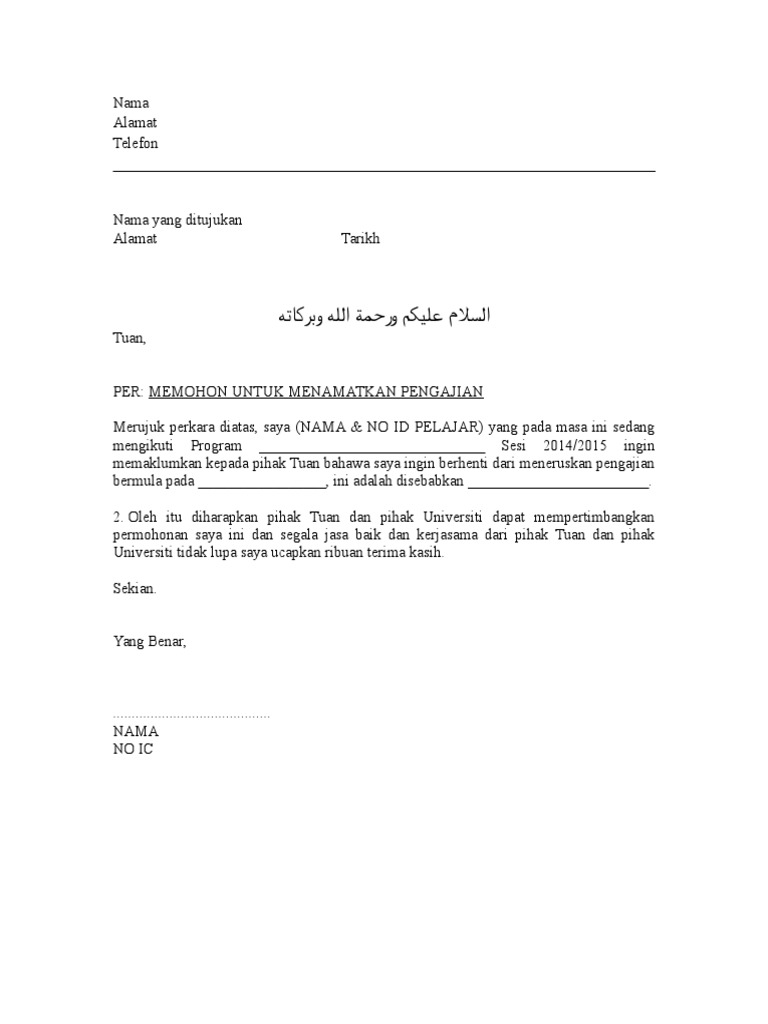 Saya Suriati Bt Abu Bakar bertugas sebagai kerani ingin. Contoh Surat Berhenti Kerja Simple. Related posts to contoh surat rasmi berhenti kerja kerana sambung belajar contoh surat rasmi.